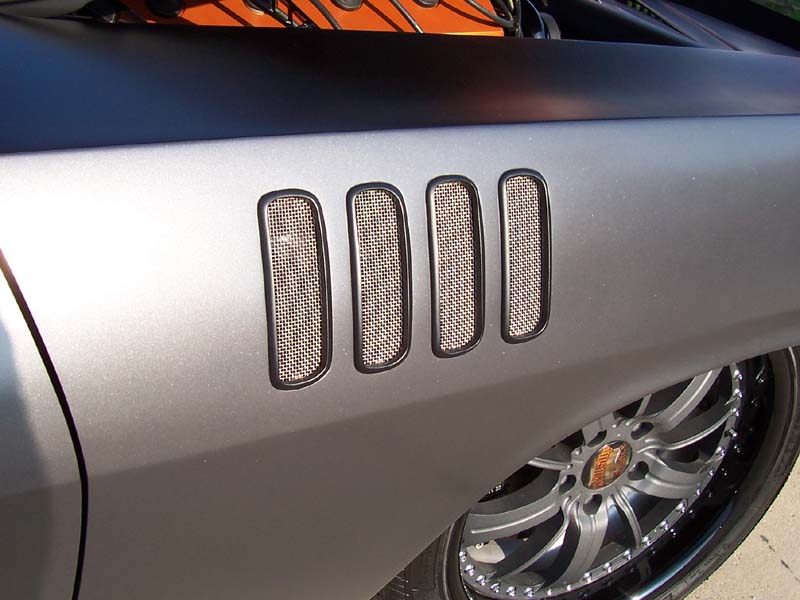 Looking at this car from the rear it's definitely all Cuda, but looking at it from the front the Challenger look prevails. This is because Lakeside used 09 Challenger headlights and grill along with a custom front facia and hood, to bring this look about. Other body mods include tucked bumpers, Frenched taillights and a wild one-off scoop. We (J&B Microfinish) made the Cuda fender vents and the THRILLBILLY front grill emblem, all milled from aluminum plate. The body work and paint was performed by the Lakeside crew with precise gaps and straight panels as a result. Their choice of color was PPG dark titanium with 2060 flex and flat clear to give the car a hot rod look