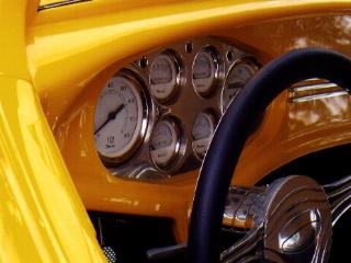 Ron then scratch built the chassis with the side rails to look like a 32 frame, tailored to fit the body and pickup bed in a highboy style. Ezra Machine provided the bedsides, while Ron fabricated the rest of the bed. Many deco details were then thought of and executed on the body, including 1/4 by 1/4 stainless ribbing throughout, custom made console, eight level ribbed firewall, 1950 Pontiac taillights recessed in custom tapered bed tunnels made from exhaust megaphones, rear bumper made from a 1949 Chevy, a 1954 Plymouth, and a 1953 Buick, 18 gauge flush fit rolled bed pan, side and front sprint-like nerf bars, front radius rods were melded into side reveals of the frame from 18 gauge flat sheet stock. All of these details were thought of and made by Ron. The paint and prep work was accomplished by Ron with help from Dave Mounce.